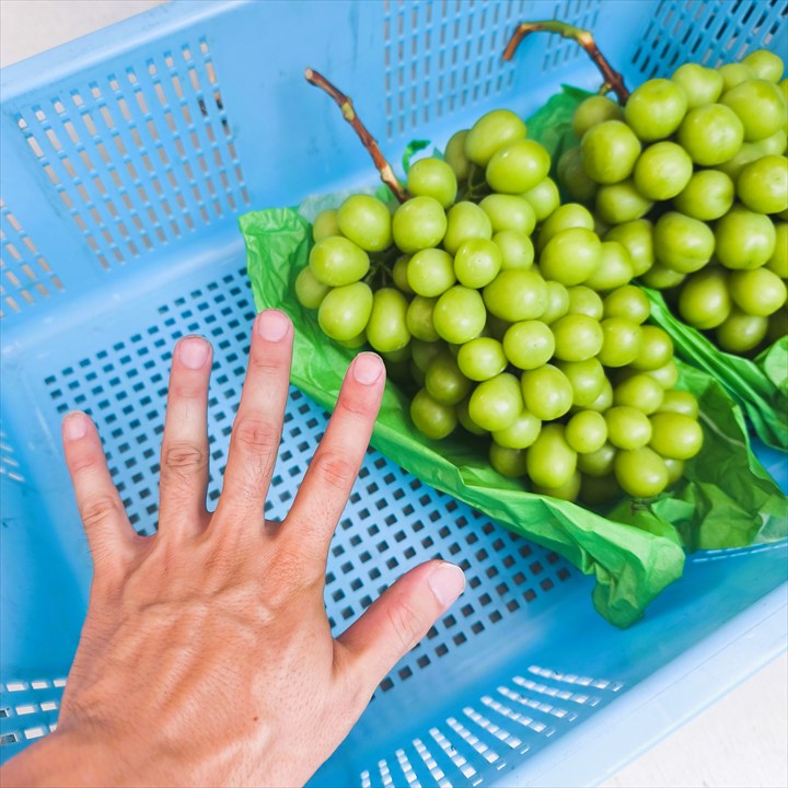 予定個数を収穫し終えると、作業場に帰り出荷調整の作業です。カサ(雨除け)の油紙を外して重量測定、重さ毎に仕分けしていきます。仕分けが終わると次は袋を外します。袋を外すと見事なシャインマスカットが姿を現しました。病気などによるロスがほとんどなく、「基本に忠実に、いつもぶどう優先で」という長谷さんの丁寧な仕事ぶりが結果に表れているのだと感じました。