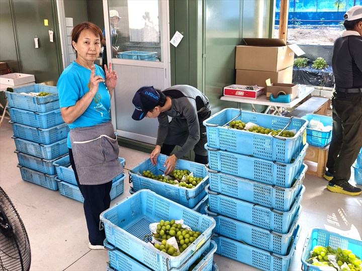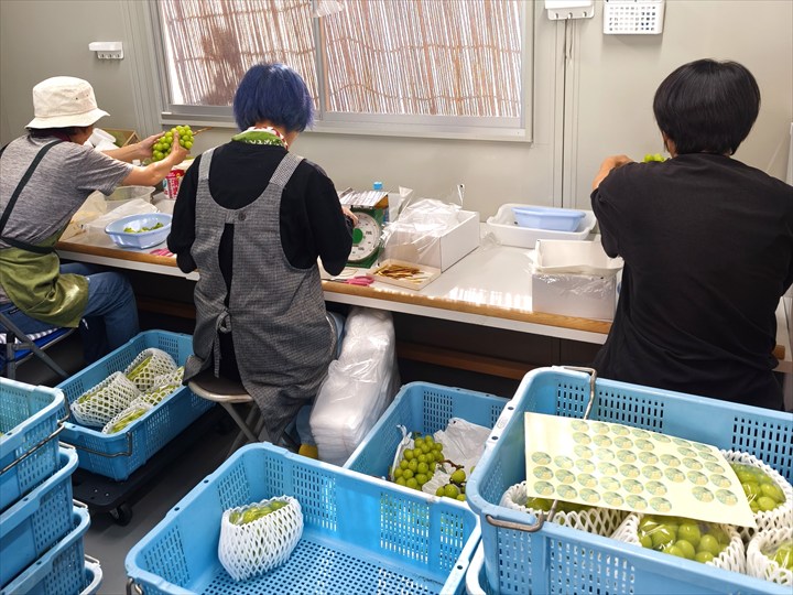 その後の調整は、袋を外したぶどうを3~4名のパートさんと社員の方が化粧箱に入れるために余分な粒を落として適度な大きさに整えます。私は「つぶつぶ」と呼ばれる枝なしのパックを作りました。不良粒を混入させない丁寧さが求められ、とても気を遣う作業です。それでも長谷さんが直販をしているのは、収益性の高さと、お客さんの声が直接聞ける喜びからだそうです。