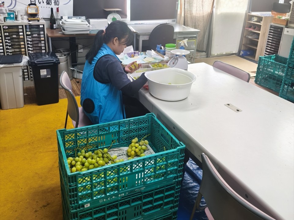 訪問してまず驚いたのは、白井さんがこの地域では「粒のパック売り」の先駆けだったということ。今ではすっかり定着した販売方法ですが、始めた当初は「ぶどうは房で売らないとぶどうらしさがない」「バラ売りはもったいない」といった声もあったそうです。白井さんはほかにも民泊との連携やキャンペーン企画、インフルエンサーとのコラボなど、様々な取り組みに挑戦しており、既存の考えや方法にとらわれない農業を目の当たりにできました。