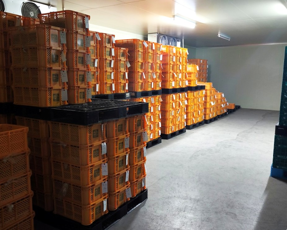 大人数で一気に総どりしていくため、最初圃場を見た時は実が多すぎて気が遠くなりそうでしたが、気づけばどんどん進んでおり、パートの皆さんも和気あいあいと作業していたため、あっという間に終わっていきました。1日あたりの収穫は110〜130カゴで、1カゴは約12kgとのことでした。中野さんの気さくな人柄が、楽しい職場環境を作っているように思います。