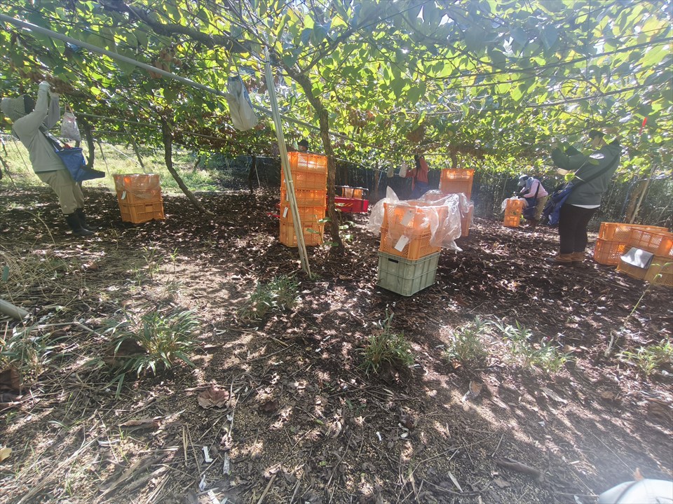 もいだ果実は腰に下げている袋に入れていき、いっぱいになったらカゴに移します。この時に、秀品と優品(日焼けや変形があるもの)、軟品(やわらかい)を仕分けします。キウイフルーツは衝撃を受けると柔らかくなる性質や、柔らかいものと一緒にしておくと周りの果実も柔らかくなってしまう性質があるため、移す際や検品の際は慎重に扱う必要がありました。また、圃場は基本的に水はけをよくするために斜面になっており、運搬機はタイヤではなくクローラー仕様。カゴを置く場所に気を付けないと倒れてしまうため気を遣いました。