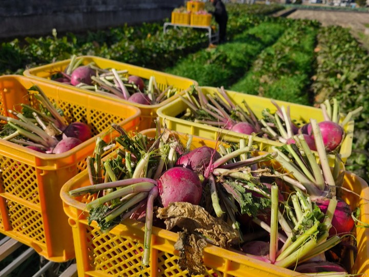 赤カブは「モモノスケ」という品種で、外皮をむくと内側は桃のような淡い色合い。甘みがあり生食でもおいしいためサラダにオススメです。カブ自体は手で簡単に抜けますが、一つひとつが重く、カゴを運ぶのがなかなかの重労働でした。収穫後は葉を落とし、洗浄機に通して袋詰めを行います。